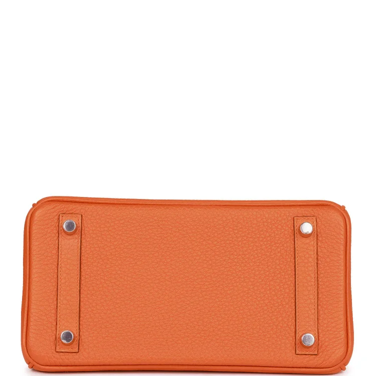This Birkin is inOrangetogo leather with palladium hardware and hastonal stitching.front flap. two straps withcentertoggle closure. clochette with lock and two keys. and double rolled handles.
