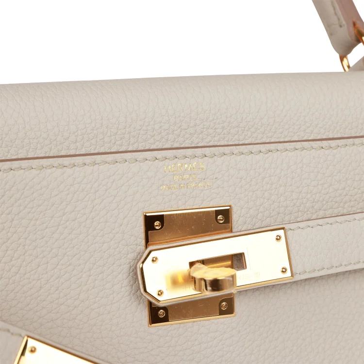 This Kelly. in the Retournestyle. is inBeton togo leather with gold hardware and has tonalstitching.front flap. two straps with center toggle closure. clochette with lock and two keys. single rolled handle and removable shoulder strap.