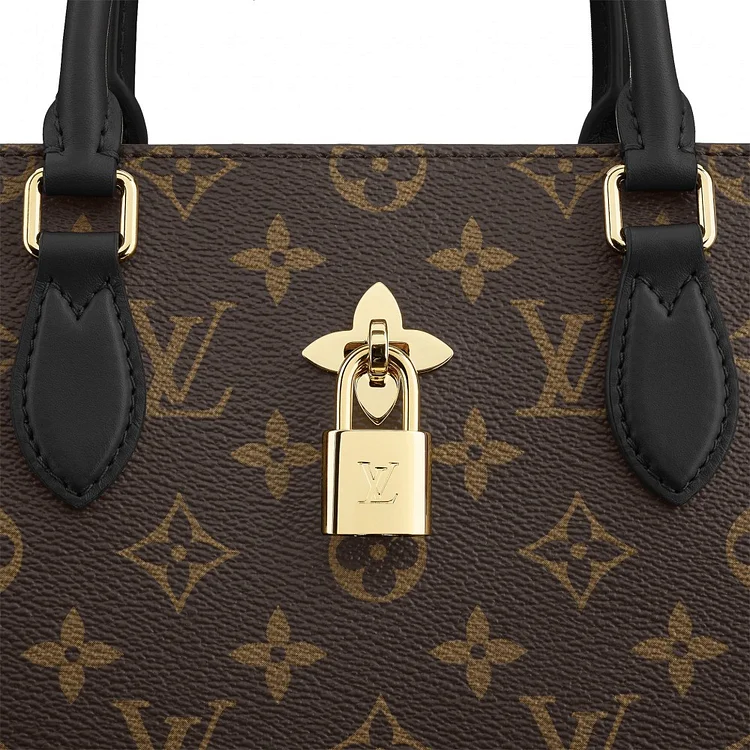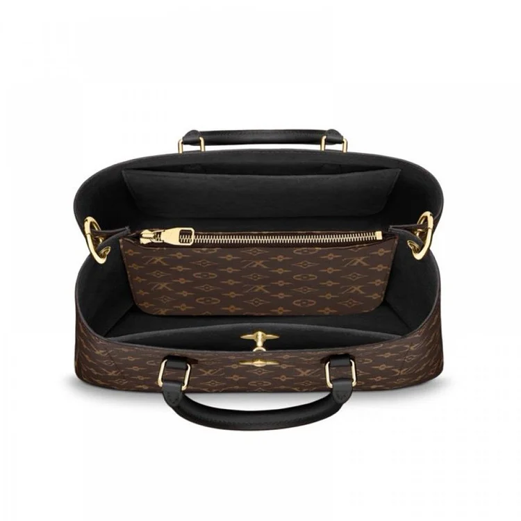 13.4 x 9.5 x 5.1 inches•Monogram coated canvas•Smooth calf leather trim•Microfiber lining•Golden color metallic pieces•Adjustable. removable leather shoulder strap•2 articulated Toron leather handles•Flower shaped padlock•Central compartment with zipped closure •2 flat inside pockets•4 protective bottom studs