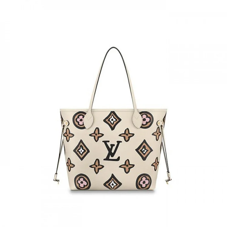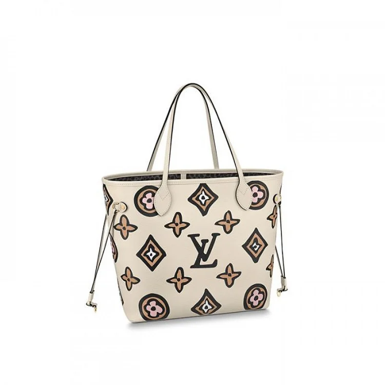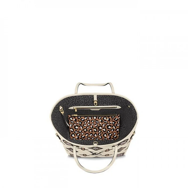 The Neverfull MM tote is arrayed this season in an exclusive Monogram print inspired by an archival design. Part of the Wild at Heart capsule. it has a boldly graphic. hand-painted look. This roomy carryall can be slipped over the shoulder or elbow and comes with a separate zipped pouch that can serve as a clutch or extra pocket.