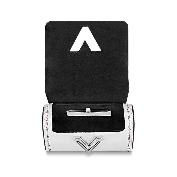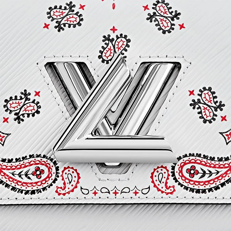 L reinvents the flowers and arabesques of classic paisley on this Twist PM handbag. Printed on the supple Epi leather. the bandana-inspired pattern complements the bag’s classic lines. The silver-color twist-lock opening and sliding chain anchor the bag in glamourous Twist territory.