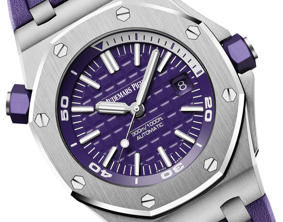 Purple dial with “Méga Tapisserie” pattern. white gold applied hour-markers and Royal Oak hands with luminescent coating. purple rotating inner bezel with zone from 60 to 15 minutes in white.