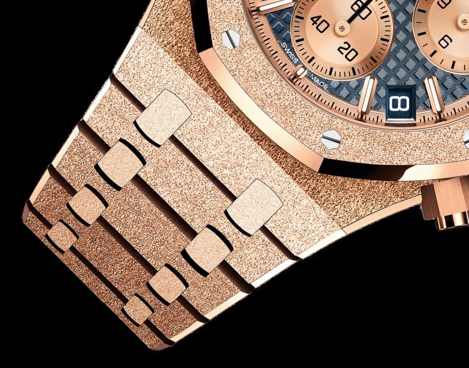 Blue dial with “Grande Tapisserie” pattern. pink gold-toned counters. pink gold applied hour-markers and Royal Oak hands with luminescent coating.
